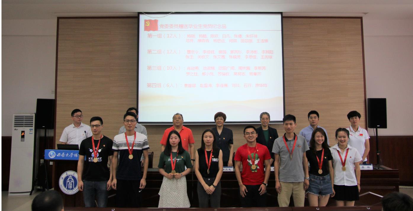 学院党委委员向毕业生了定制奖牌,每一块奖牌上背面为西南大学校徽,正面印有党徽、毕业生党员姓名、入党日期和“不忘初心、牢记使命”寄语。