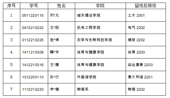 经核实并经学院(系)组织学生本人确认,共有刘*凡等7名学生达到留级标准。根据《普通本专科学生学籍管理暂行规定》(校教字〔2022〕29号),经教务处处务会研究,同意刘*凡等7名学生留级,请相关学院(系)按规定办理留级手续。