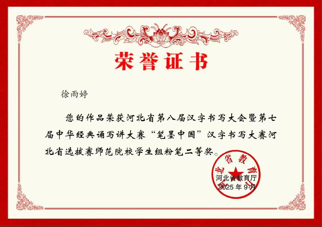 日前,从河北省第八届汉字书写大会暨第七届中华经典诵写讲大赛“笔墨中国”汉字书写大赛河北省选拔赛的结果获悉,我校师生表现优异,斩获多项荣誉。余青烨、吴紫璇等2名同学荣获大学生硬笔书写组二等奖;陈思雨(小学教育专业)、黄承奕、陈思雨、王超文等4名同学荣获大学生硬笔书写组三等奖;徐雨婷同学获师范院校学生组粉笔书写二等奖;胡子彤、于欣两位同学分获师范院校学生组粉笔书写优秀奖;王瀚茁、滕梓怡同学在大学生组诵读比赛中分获二、三等奖;周丽娟老师荣获教师组粉笔书写一等奖。此外,余青烨、吴紫璇、徐雨婷等同学以及周丽娟老师的共7份优秀作品,经组委会遴选推荐参加全国总决赛。