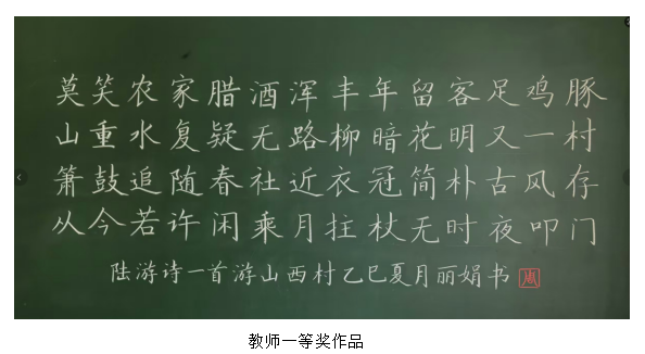 其中,周丽娟老师的粉笔字作品《游西山村》荣获大中学教师组一等奖,也是本届比赛中河北省唯一获此等级奖项的教师。徐雨婷、余青烨两位同学分获大学生组粉笔字与硬笔字优秀奖。