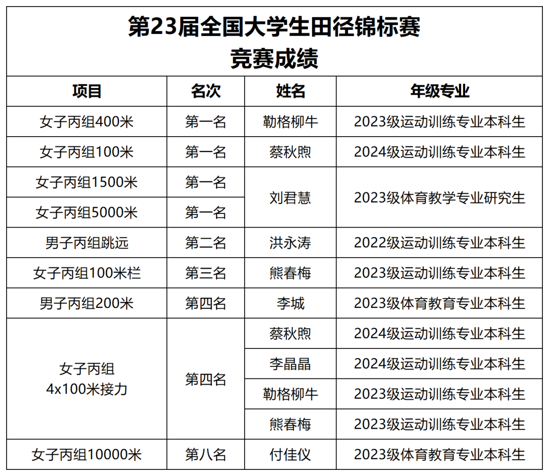 8月15日,第23届全国大学生田径锦标赛在湖北黄石奥林匹克体育中心圆满落幕。我院田径健儿在为期6天的激烈角逐中,凭借顽强的拼搏精神和出色的竞技水平,最终取得4金1银1铜,以及2个第四名、1个第八名的亮眼成绩。其中,2023级体育教学专业研究生刘君慧表现尤为突出,成功蝉联三届女子丙组1500米、5000米双冠;2024级运动训练专业本科生蔡秋煦和2023级运动训练专业本科生勒格柳牛也不负众望,分别摘得女子丙组100米、400米金牌。
