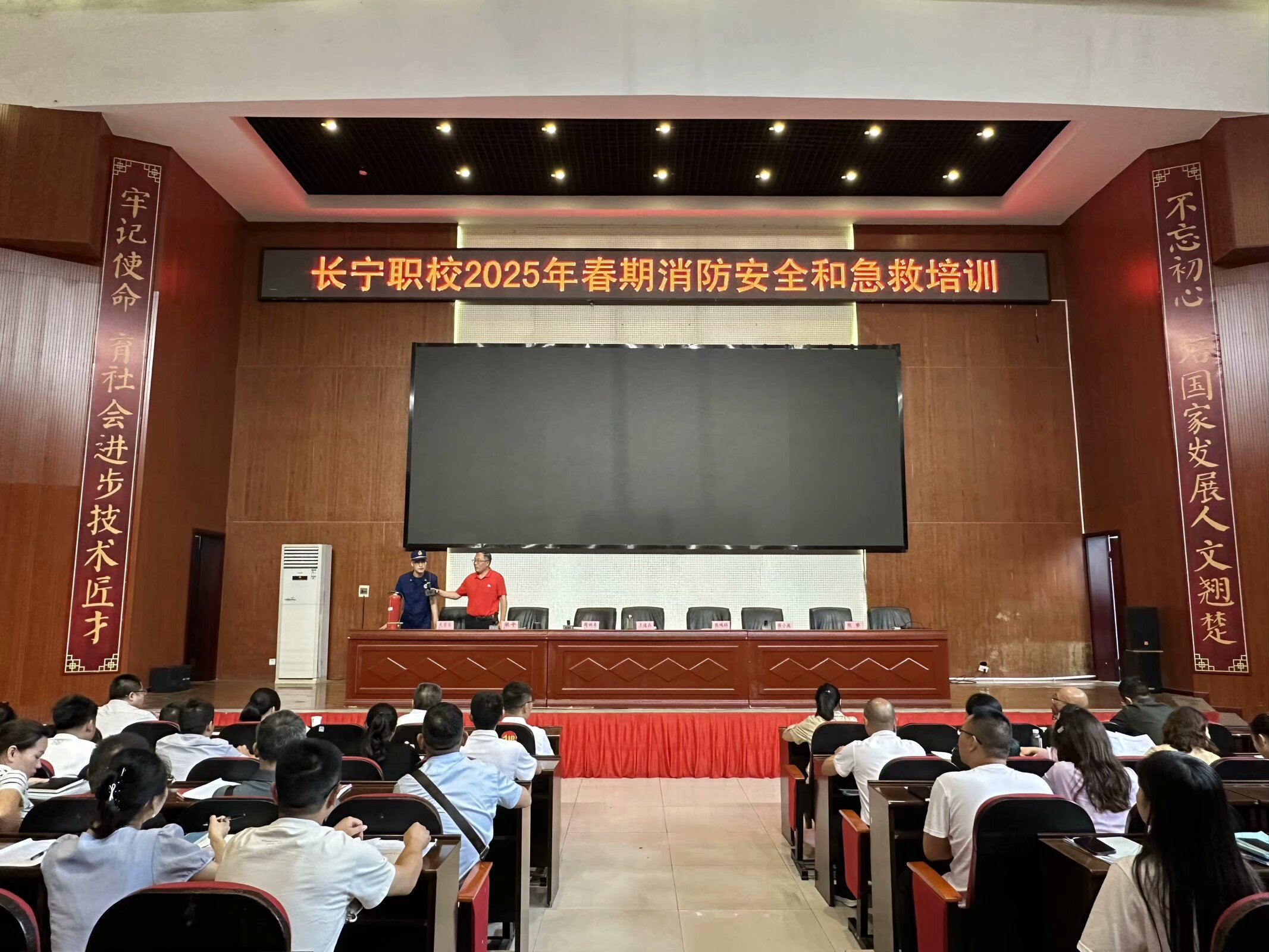 会议首先开展2025年春期消防安全和急救培训。长宁县消防救援大队徐旭宏警官结合校园实际,从灭火器检查、使用规范及师生日常用水用电安全等方面进行详细讲解,强调“预防为主、防消结合”的安全理念。随后,长宁镇中心卫生院副院长巫宏韬带来 CPR 心肺复苏实操培训,重点解析“30次胸部按压+2次人工呼吸+ 5次循环操作”的黄金救援要领,通过理论与实践结合,提升教职工应急处置能力。