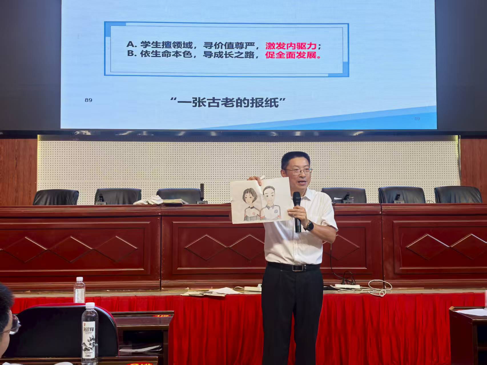 王辉老师分享了大量真实管理案例,现场展示了包括班级T恤、班报、学生成长手册在内的多种带班实物,生动呈现了他与烹饪班、“9+3”学生、电子班学生之间的感人故事和教育历程。最后,王辉老师以“学习、团队、尊严、男子汉、对决、陪伴”等主题词点明班主任工作的核心就是用心、用时、用情。