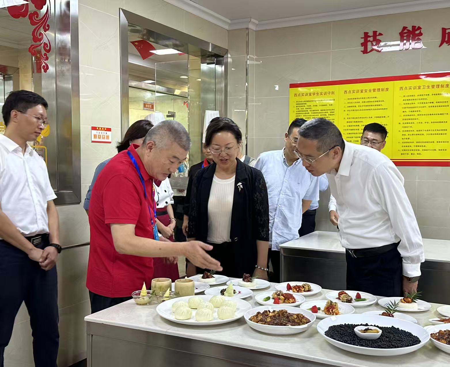 大赛现场设在我校烹饪实训基地,来自全省各地的参赛选手围绕川菜热菜、中式面点等核心项目展开激烈比拼,刀工火候间尽显专业风采。杜伟一行沿比赛工位细致察看,重点询问学校教学设备更新进度、课程设置与餐饮行业需求的适配性。当得知我校中餐烹饪专业与多家餐饮企业开展校合作,毕业生除升入高职院校外,就业率达100%时,他予以高度肯定,并结合我校下一步发展实际,提出五项工作要求:一是强化学生综合管理:加强德育与安全管理,同步培养学生良好行为习惯和学习习惯,筑牢成长根基;二是建强师资队伍:聘请省、市、县工匠大师担任兼职教师,助力学生提升专业技能,以“大国工匠”为培养目标;三是打通升学通道:对接市内三所高职院校,实施中高职衔接办学,为地方高职院校输送更多优质人才;四是升级实训载体:邀请赛事大师参与实训基地设计,将中餐烹饪实训基地打造为专业比赛场地,以赛促学;五是优化专业布局:对接市县市场企业人才需求设置专业,定向培养地方经济发展需要的高技能人才。