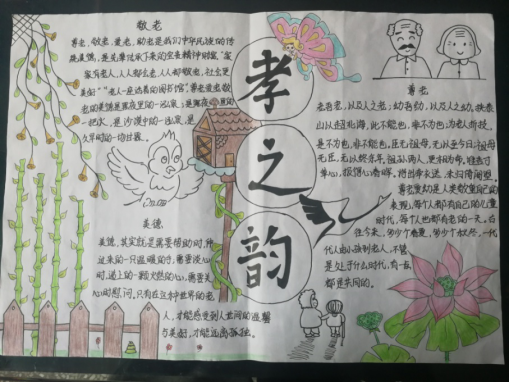 四是办手抄报:全校各班以“敬老爱老”为主题办手抄报。各班的手抄报形式多样,内容丰富。班级有效利用手抄报对学生进行尊老敬老教育,切实让学生更加深刻的理解尊老敬老的内涵。