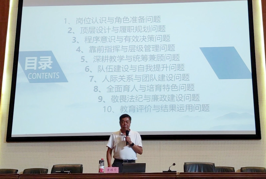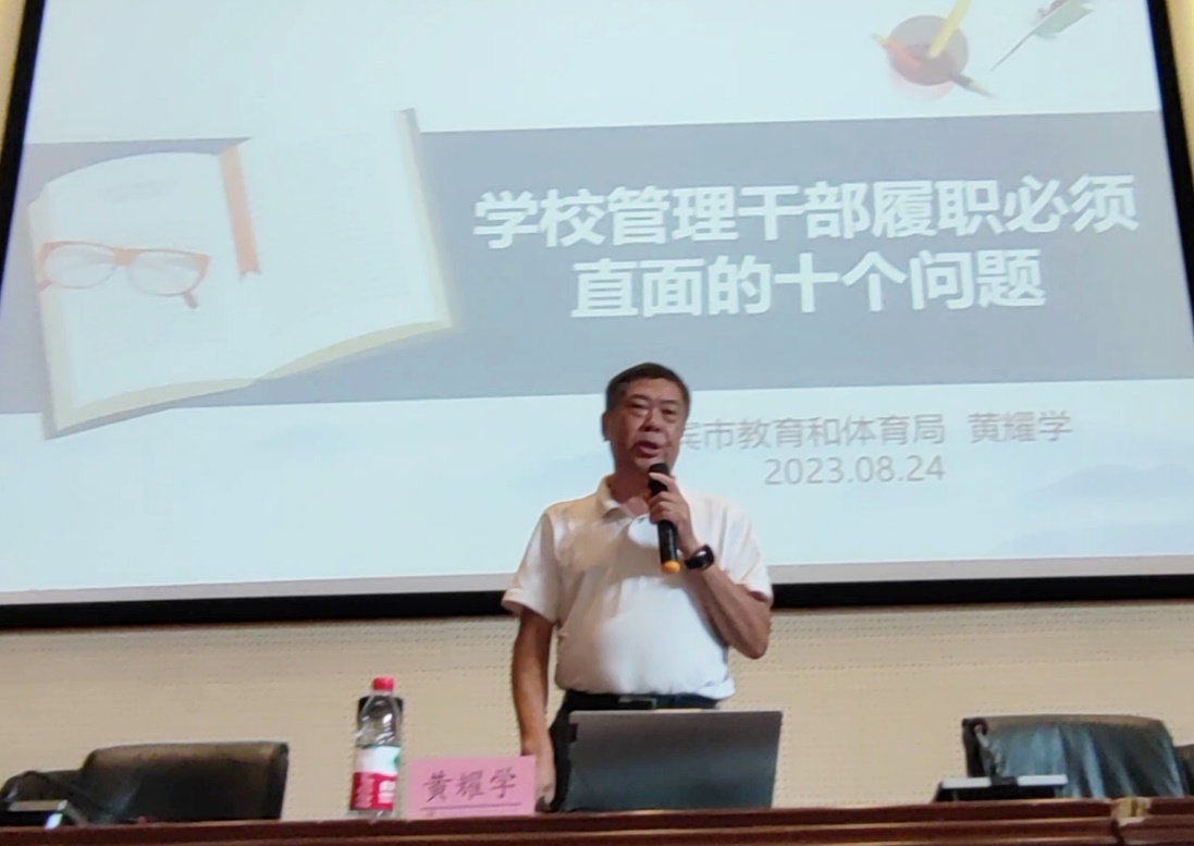 下午,黄耀学为全校管理干部、县级骨干教师、近三年新教师带来了《学校管理干部履职必须直面的十个问题》的专题讲座。黄督学首先明确党的二十大报告中关于教育的表述,并带领教师们进行深刻领悟,接着对岗位认识与角色准备、顶层设计与履职规划、程序意识与有效决策、靠前指挥与层级管理、深耕教学与统筹兼顾、队伍建设与自我提升、人际关系与培育特色、敬畏法纪与廉政建设、教育评价与结果运用十个问题进行了详细的阐述。黄耀学指出,坚持以党的二十大精神指引中职学校“五育并举”实践,不断完善立德树人落实机制,为构建高质量教育体系做出更大贡献。