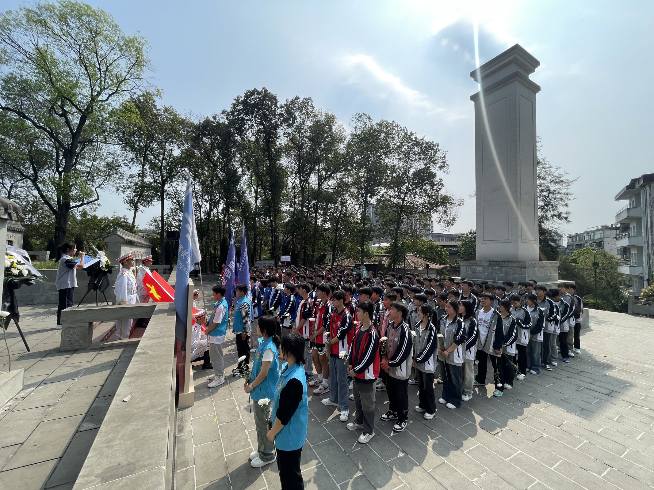 在革命烈士纪念碑前,全体师生列着整齐的队伍,仰望着鲜艳的五星红旗,带着最诚挚的敬意奏唱《中华人民共和国国歌》和《中国共青团团歌》。而后,礼仪队向革命烈士敬献花圈,全体成员默哀。