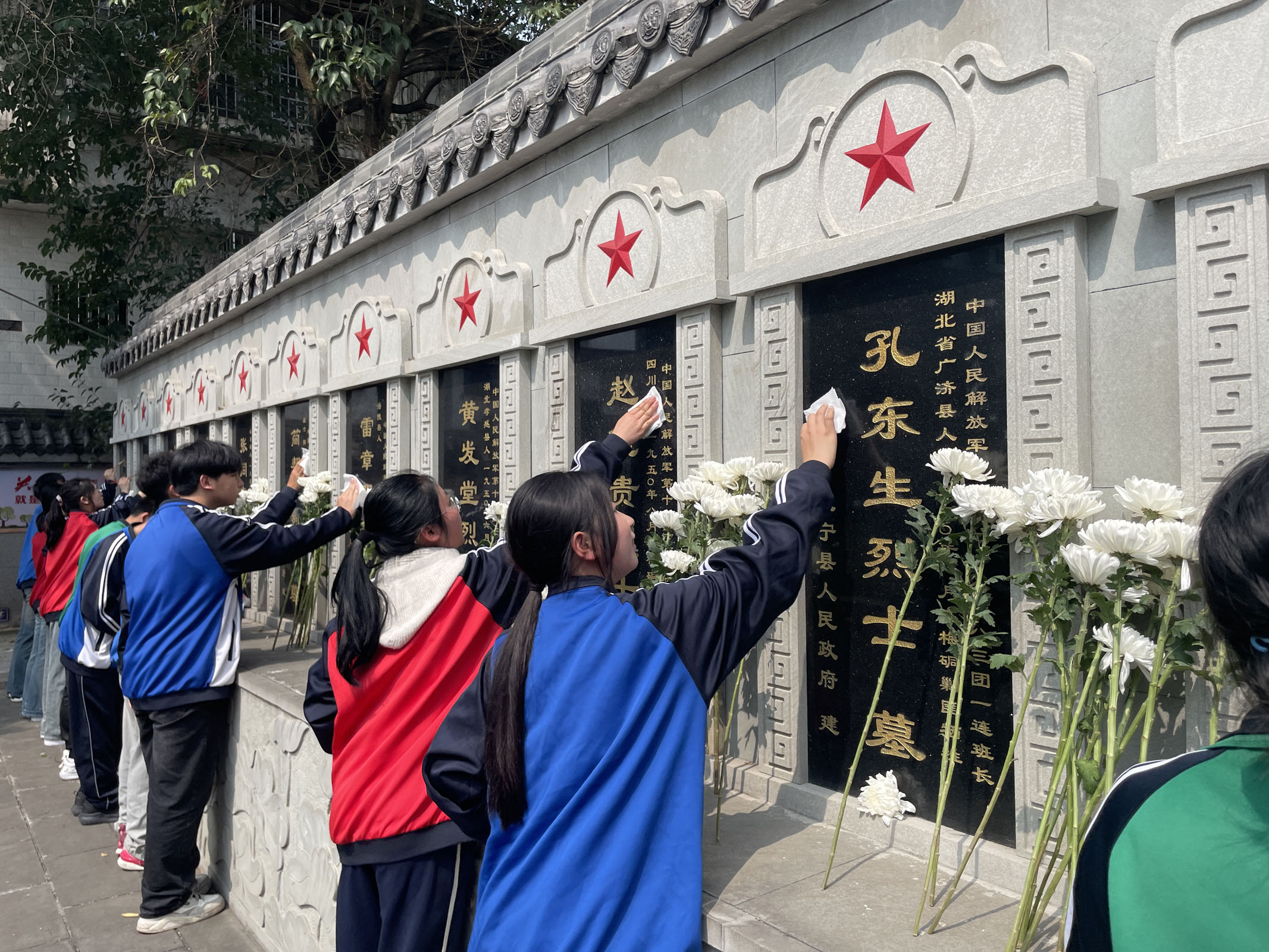 身既死兮神以灵,子魂魄兮为鬼雄,革命烈士英灵不泯。全体成员参观烈士纪念馆,观看纪录片,更深入地了解烈士事迹。学生到烈士墓前敬献白花,为烈士擦拭墓碑并描金,寄托哀思。