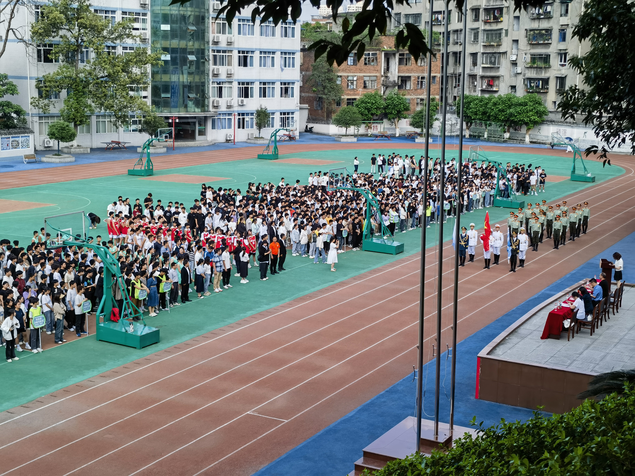 庄严肃穆的升旗仪式后,龙碧容致开幕辞,希望全体运动员大力发扬体育精神,赛出友谊、赛出风格、赛出水平,取得比赛成绩和精神文明的双丰收;赛事工作人员精心组织、认真工作、热情服务。大家一起努力,力争把本次篮球比赛办成一个“文明、热烈、精彩、圆满、和谐”的盛会,为实现我校“办活力校园、铸匠才高地”的办学目标尽到自己的一分力。