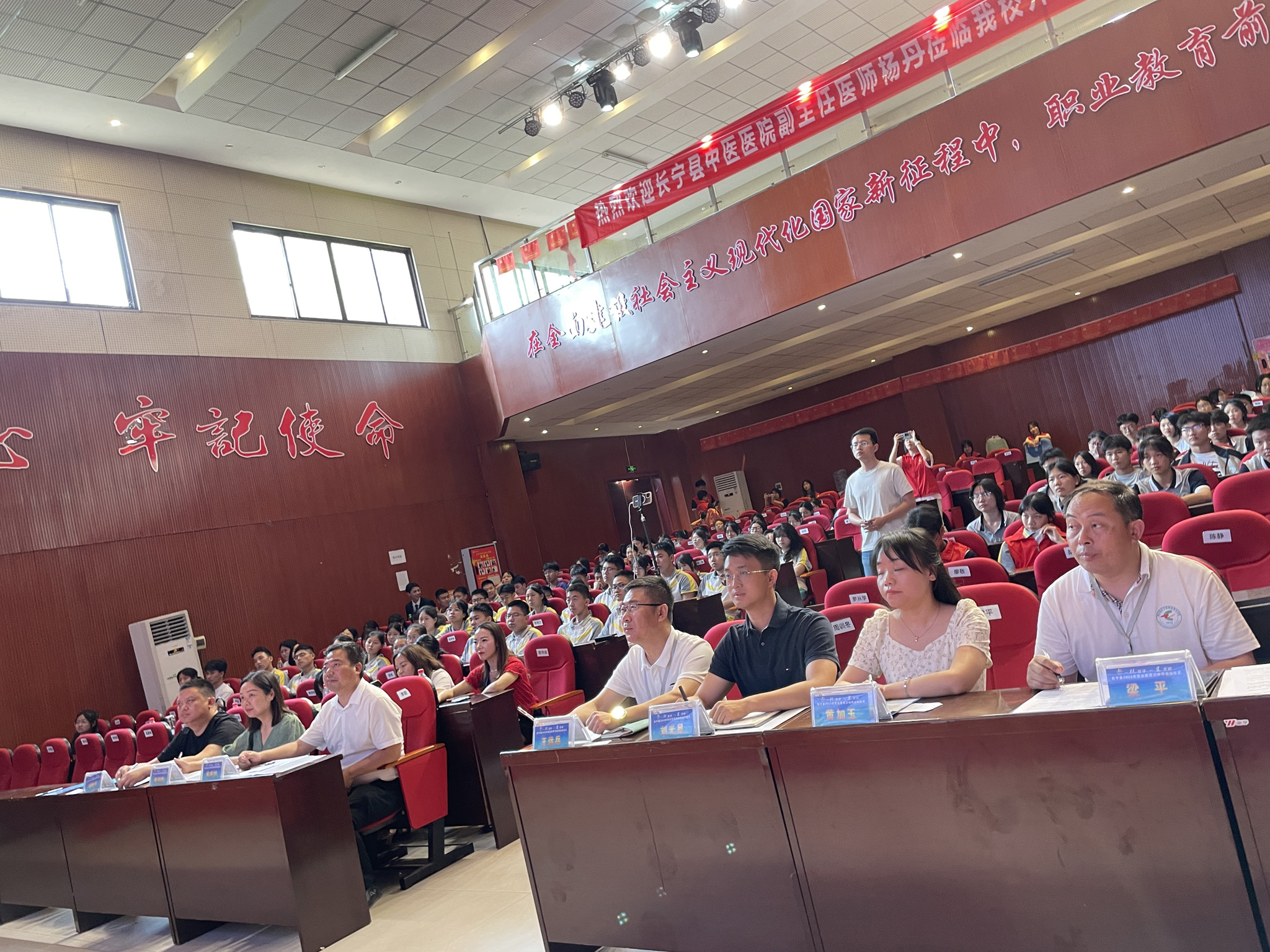 县融媒体中心副主任宋成均,共青团县委副书记、县教体局人事股股长黄加玉,长宁镇党委副书记、长宁职校团委副书记刘光星,教育局副股长邓世军,长宁职校党委副书记、校长王运兵,长宁职校党委副书记、纪委书记熊鸿焰,长宁职校党委委员、副校长梁平,长宁职校团委书记陈瑶等领导莅临现场。
