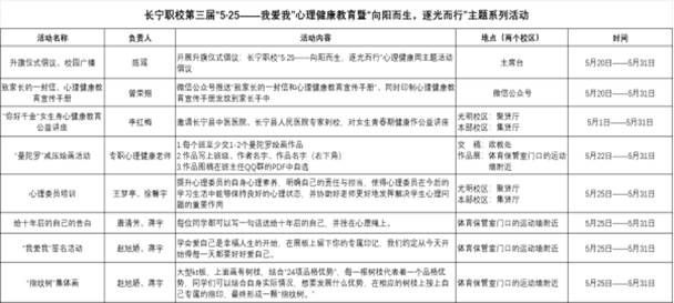 为认真贯彻落实长宁县教育和体育局关于印发《“5·25—我爱我”心理健康周活动方案》的通知精神,进一步推进我校心理健康教育工作,宣传普及心理健康知识,切实提高师生的心理素质,努力促进学生身心和谐发展,长宁职校将每年5月定为心理健康月,开展了第三届“5·25我爱我—向阳而生,逐光而行”心理健康周系列活动。