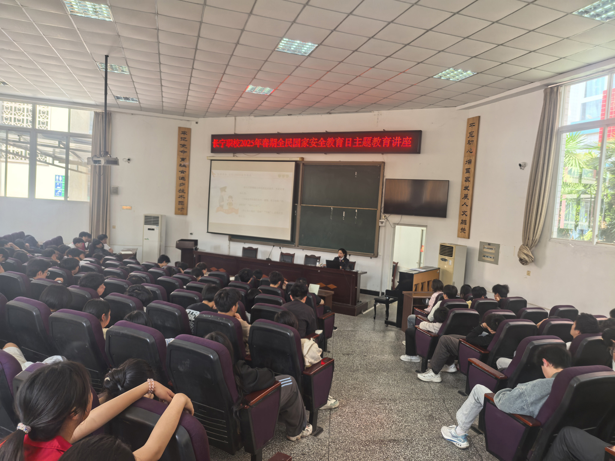 为增强全校师生的国家安全意识,切实保障国家安全,4 月 15 日,长宁职校在光明校区集贤厅举办了 2025 年春期全民国家安全教育日主题教育讲座。此次讲座由政教处主任周玲主持,长宁县检察院检察官、法治副校长李梦担任主讲人 。