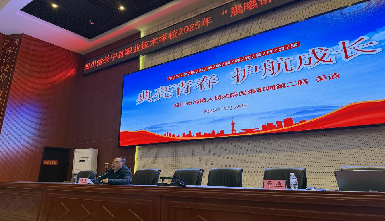 为深入推进青少年法治教育,增强学生法治观念,3月28日长宁职校在集贤厅开展了以“法治进校园”为主题的“晨曦讲坛”第一讲。本次活动特别邀请到四川省高级人民法院民事审判第二庭吴清法官主讲。讲坛以“典亮青春 护航成长”为主题,旨在学习民法知识,护航新时代美好生活。